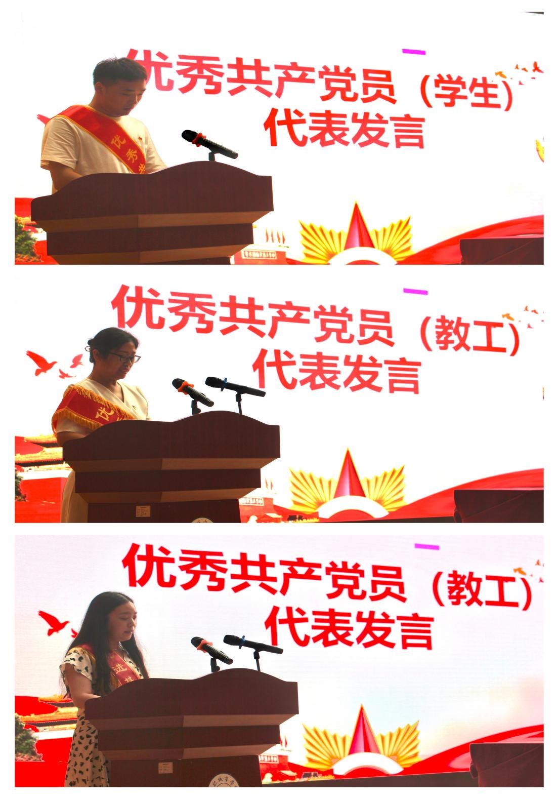 优秀学生党员代表、建筑与艺术学院2021级环境设计专业(专升本)林斗龙同学,优秀教工党员代表、土木工程学院教师王静同志,基层党组织代表、机械与电气工程学院学生第二党支部书记胡成凤同志分别发言,她们总结了一年来在思想上、学习上、工作上取得的进步,分享了个人和集体取得的成绩和经验,表示绝不辜负党组织的殷切希望,珍惜荣誉,谦虚谨慎,再接再厉,发挥党员先锋模范作用,在平凡的岗位上作出新的更大的贡献。