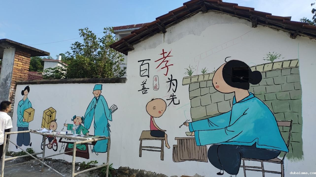 经过十天时间的绘画,团队九个人共绘画墙绘作品十余幅,墙绘面积110㎡,那些原本单调不起眼的墙体,变成了反映乡村风貌的美丽画卷,变成了一道道描绘着和谐、文明、人文、艺术的乡村风景线,变成了村民建设美丽新乡村的美好寄托。