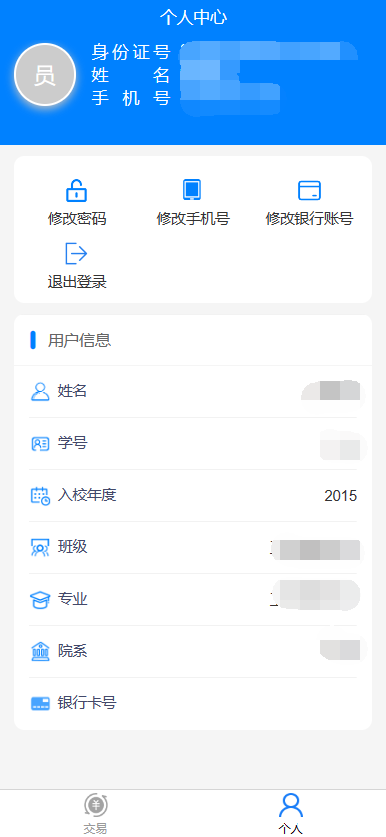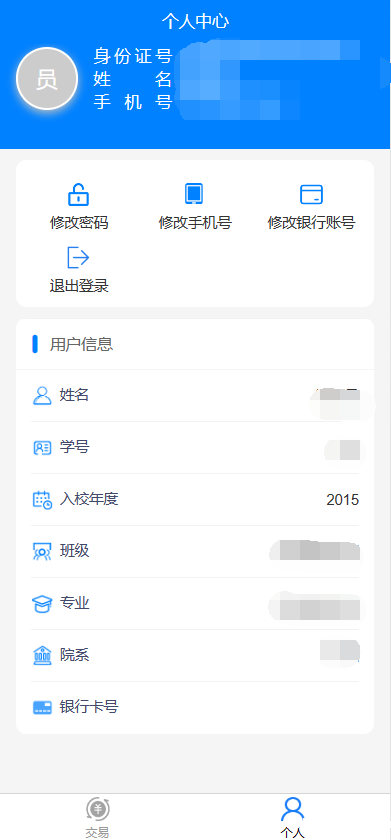 6.点击个人即进入个人中心,在个人中心可以修改登陆密码,银行卡号