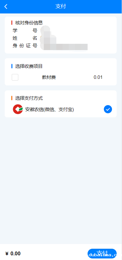 4.交易前请仔细核对个人信息(如有错误,请联系老师更正后再进行缴费)
