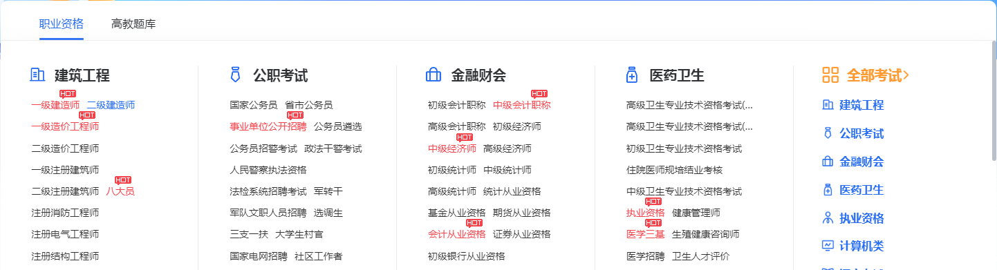 职业题库包含公职考试、建筑工程、语言考试、金融财会、计算机类、医药卫生、研究生类、执业资格、综合技能、学历考试十大行业,超300个考试分类3000余门考试科目,共40余万套试卷,包含试题资源2400万余道;能够满足全行业门类、各知识领域用户的考试服务需求。